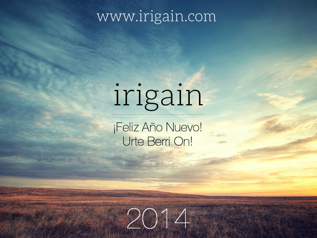 ¡Feliz año nuevo! 02/01/2014 · de irigain · en Irigain. · Desde Irigain os deseamos un Feliz Año Nuevo y esperamos que el 2014 sea un buen año para todos. Empezamos el 2014 con nuevos proyectos y mucha energía. Zorionak eta Urte Berri On guztioi! Me gusta Cargando... Relacionado